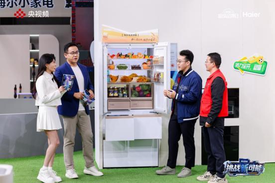 具体来看,在京东渠道,海尔联合央视频、京东超级品牌日共同打造《挑战新可能》节目,通过一系列极限挑战,将科技转化为可感知的体验。比如海尔麦浪冰箱历经千里运输,箱内食材抵达后仍旧鲜润如初。此外,海尔还打造“周五足场日”IP,将家电产品与球迷生活场景强关联。直播间内,主播身着球衣,场景布置充满球队元素,氛围感十足。