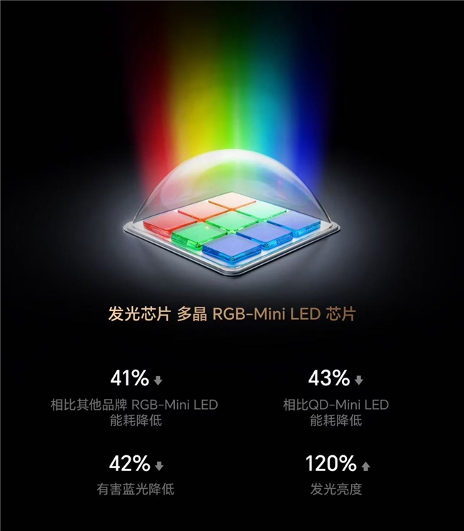 今年由海信首发的RGB-Mini LED电视,以RGB三原色背光直显的颠覆性显示技术,在行业中掀起了一场“原生色彩革命”,其具备超大的色彩空间,无需量子点即可实现100%BT.2020覆盖,比QD-MiniLED高19%,比QD-0LED高9%;以87%超高色彩体积,领先QD-Mini LED 20%,领先QD-OLED 3%,并以近100%的超高色彩纯度、超高亮度、超广视角、超低能耗的特性,在画质和节能方面全面超越QD-OLED,成为行业公认未来十年最具发展潜力的液晶显示技术。