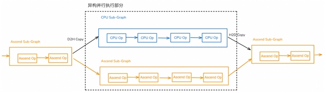异构并行范式中,把计算图切分成CPU子图和NPU子图,二者如果不存在数据依赖则可以昇思异构并行运行时支持同时下发、同时执行这些子图,实现host device并行计算。