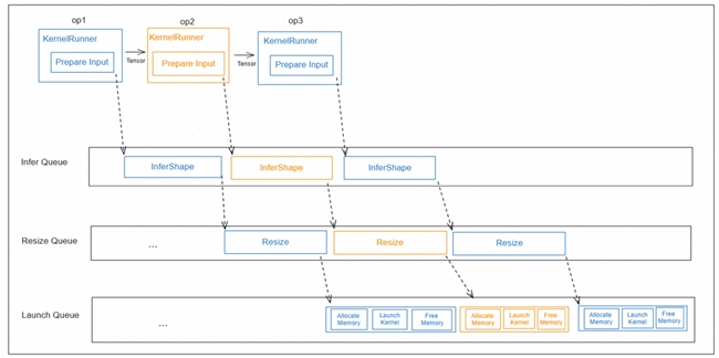 工作流程:多级流水工作流程由高层队列将需要异步执行的task,push到低层队列中,高层队列继续执行同类业务,和低层队列的业务并发起来。按照算子调度的业务类型划分,需要InferQueue,ResizeQueue,LaunchQueue三级队列。KernelRunner完成输入数据准备后,只需将InferShape task推入Infer队列即可。InferShape完成后自动触发Resize task到Resize队列,Resize完成后自动触发LaunchKernel task到Launch队列。多级流水完全工作在C++侧,由运行时调度,不和Python侧交互,另外不用单独处理自动微分流程,反向算子已经入图,这两点是和动态图多级流水的主要差异点。