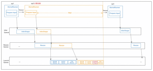 针对计算依赖算子(如Unique需完成计算才能知道输出shape),KernelRunner下发完InferShape task后,需要wait三个队列完成,在Unique这类算子的launch完成后,更新输出shape和size,再调度后续算子。