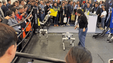 在宇树科技的展台区,观众依然是里三层外三层,大家的热情非常高。要想近距离观看宇树 G1 机器人格斗比赛的话,那就得用力从人群中挤进去了。