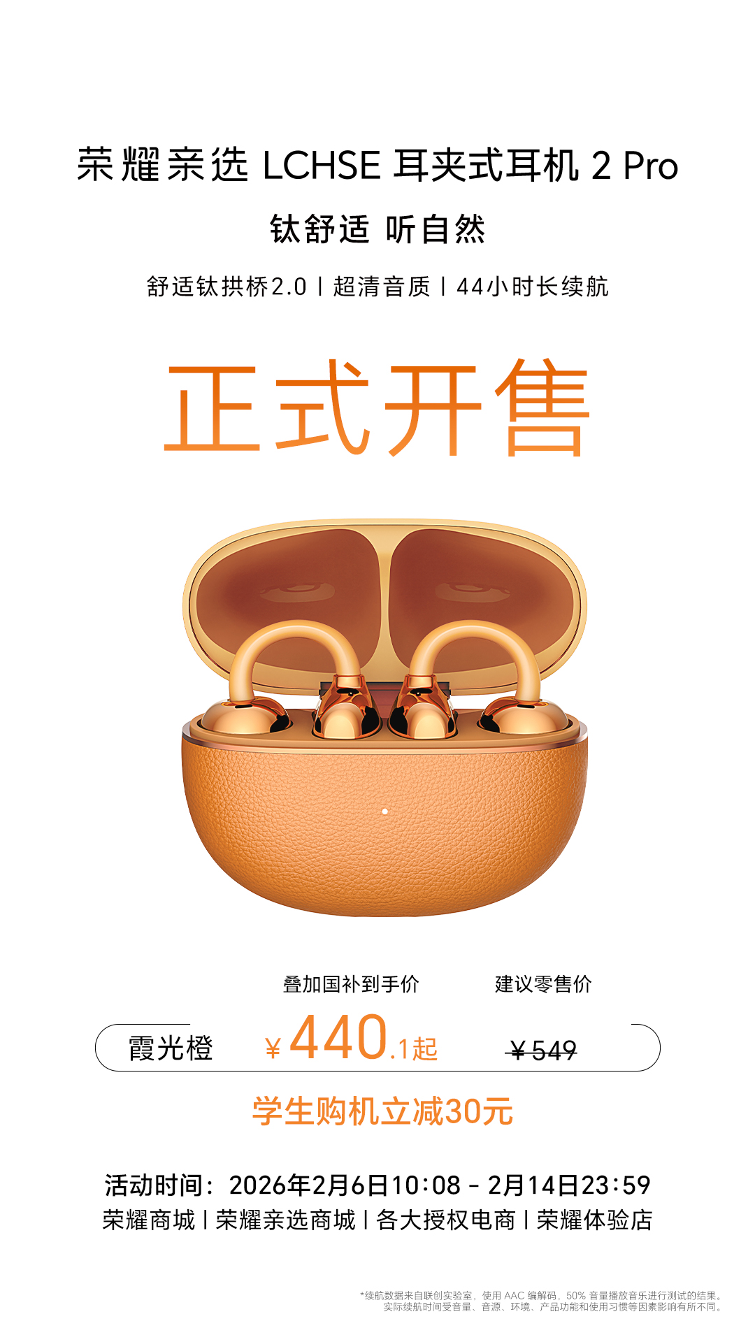 2026年货节“橙”意满满 荣耀耳夹耳机学生专属优惠410.1元起