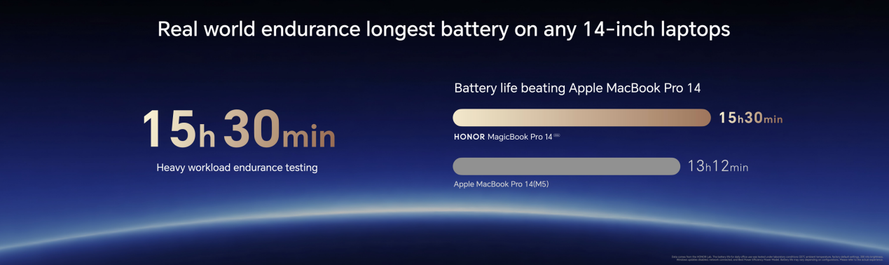 作为14英寸轻薄本续航标杆,荣耀MagicBook Pro 14 2026配备92Wh大容量电池,结合新一代自研HONOR Turbo X技术,带来15.5小时的超长续航表现,全面超越苹果MacBook Pro 14,再次刷新14英寸轻薄本行业的超长续航纪录。