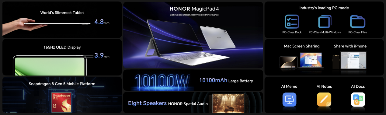 全新旗舰平板荣耀MagicPad4 Pro亮相发布会,兼顾极致轻薄与强悍性能,比iPad Air更纤薄,比iPad Pro更强大。荣耀MagicPad4 Pro薄至4.8毫米,边框窄至3.9毫米,采用3K 165Hz高清屏,至高290 PPI与2400尼特,具备七大绿洲护眼技术加持,拥有行业领先的影音显示效果。同时,其搭载更满配硬件配置,内置第五代骁龙8旗舰芯片与10100mAh超大容量电池;在AI加持下,产品生态互联实现跨越式升级,可与苹果设备轻松跨界互联,支持内容自由转移、屏幕实时共享。荣耀MagicPad4 Pro拥有业界领先的PC模式,多窗任务、桌面布局、文件管理等全场景实现PC级生产力,更在业界率先接入OpenClaw,带来比传统PC更加智慧的AI领先体验。