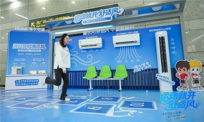 走进五四广场地铁站,一处别致的展区格外醒目。这里不是普通的广告位,而是海尔空调为运动爱好者们搭建的“能量加油站”。参与者可以站在海尔舒适风空调前,体验“人近风柔”的神奇变化:当你走近,原本直吹的风立刻变得柔和,仿佛能感知你的存在。